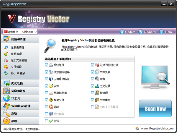 ①注册表清理:Registry Victor对电脑进行彻底的扫描和诊断