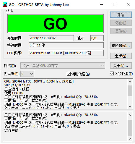 1、这次去掉了选择CPU0和CPU1的选项,运行一个ORTHOS即可对CPU的两个核心同时进行测试,绝对达到满载,测试压力也更大,也更严格