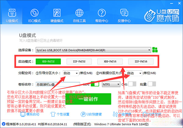 2、支持UD、ISO、UDM、U+、本地硬盘模式。其中“优盘模式”分区方式有两种,方式1占用更小体积能兼容绝大多数机器,方式2占用空间大兼容性更强。"优盘模式"需要优盘支持多分区,如果优盘不能多分区则可能会制作失败,此时请转投"ISO模式"。