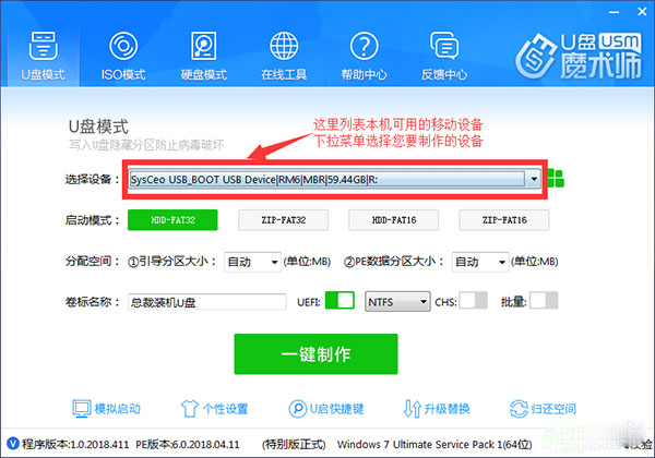 本页主要是对移动设备PE的UD模式制作,提供的功能有:自动智能扫描并检测当前可用的移动设备、自定义制作参数、自定义PE菜单内容及PE系统壁纸等设置、模拟PE启动界面、归还移动设备空间,升级替换PE、一键全自动制作。
