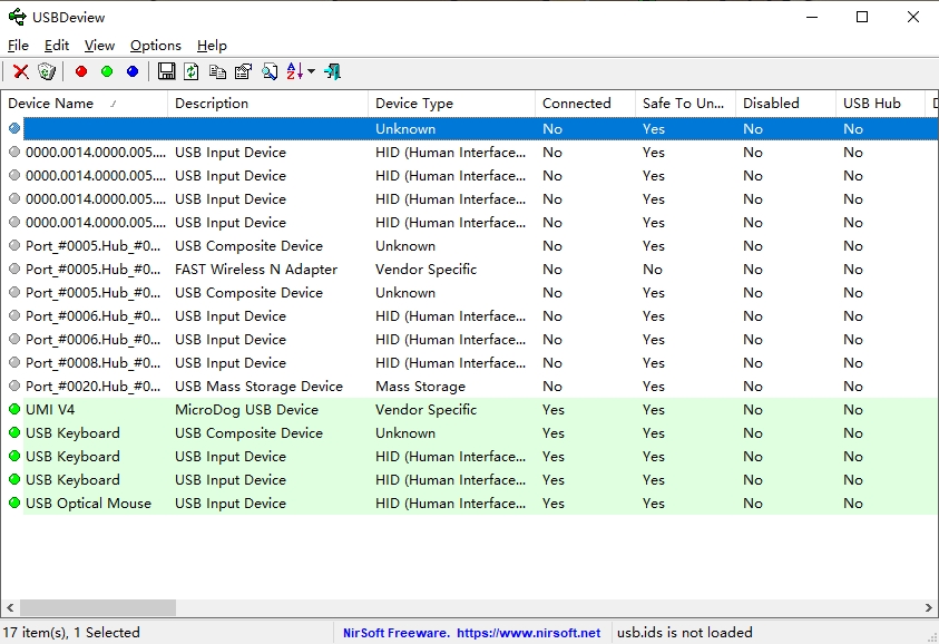 使用本站提供的USBDeview,它的好处是可以查看此电脑上所有的正在使用和曾经使用过但已拔出的USB接口设备,包括键盘鼠标、摄像头、U盘、移动硬盘等。
