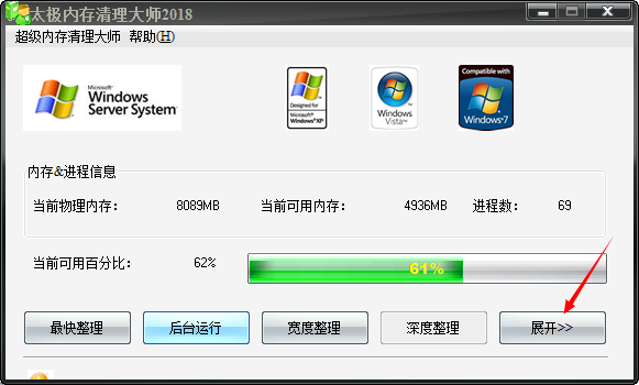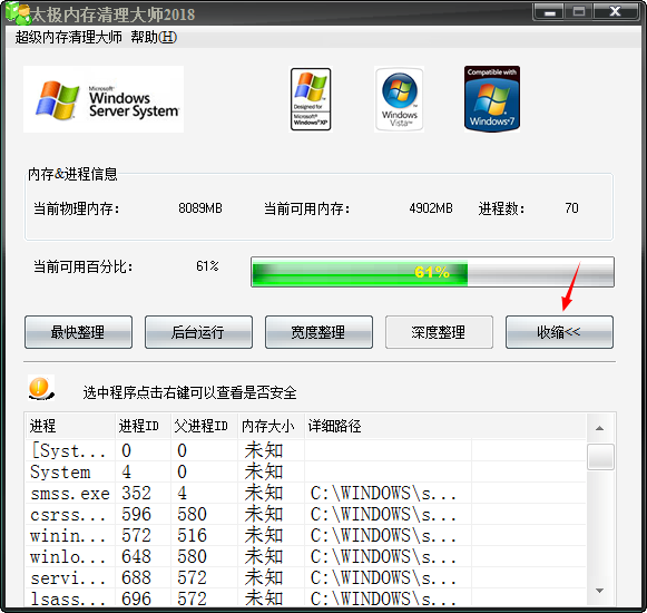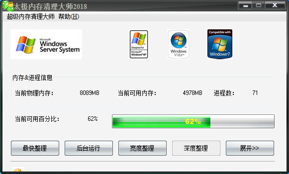相信大家电脑运行久了,可用的内存便会越来越少,其中很大的一方面原因就是因为一些软件在退出的时候没有及时释放掉占用内存的一部分,而太极内存清理大师恰恰可以用来清理这些内存。太极内存清理大师是一款绿色免费的内存清理软件,该软件非常的小巧,不会伤害硬盘,其自身资源占用率也极低,可以设置自动清理时间,功能强大可以释放软件退出时未有效释放的内存,不会读写硬盘,软件在运行时可以自动清理内存,这样就不需要用户经常操作了,使用起来也变得非常方便。 软件还可以对系统进程进行监测,可以查看进程路径,属性,在线查看进程信息,终止进程,新建进程等,方便用户随时关心自己的进程是否染毒,同时本程序还支持换肤功能。