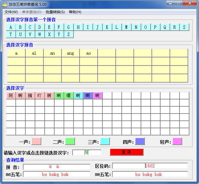 “悠悠五笔拼音查询”是一款免费的快速查询五笔86编码、五笔98编码、拼音(含声调,多音)和区位码的字典软件。它操作简单,是一款漂亮的五笔编码拼音查询软件,软件既能够单字查询,又能够批量转换。