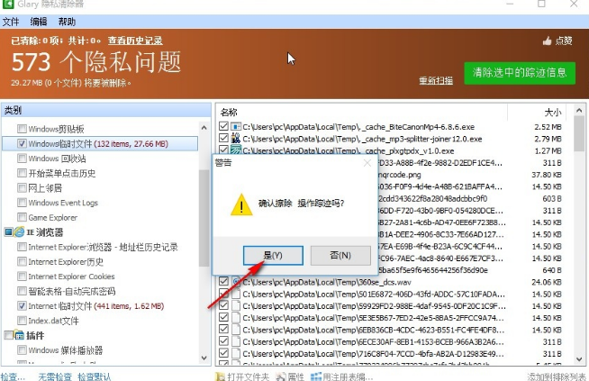 4、点击这个按钮之后会出现下图所示的一个询问界面,点击其中的“是”这个按钮我们就可以开始擦除隐私数据的操作了。