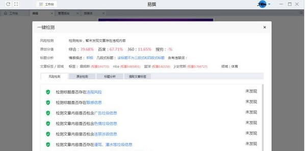 利用先进的大数据NPL算法,对稿件进行涉黄涉政广告垃圾用语等违规风险进行检测、对标题违禁检测、对正文进行全网原创相似度检测(将深化覆盖至全自媒体平台)、对稿件领域进行分析判断、对正文进行标签提取、对稿件进行传播度检测。