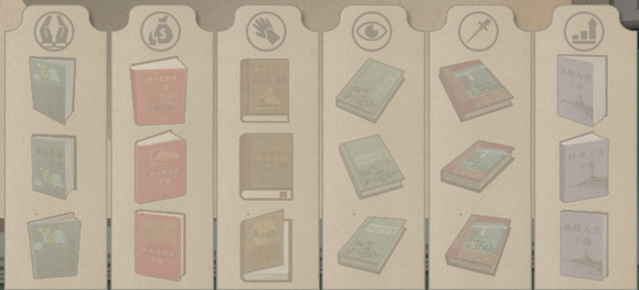 游戏中的书籍一共六本,每本分为上、中、下册。每册可单独赠送,其稀有度分别为蓝色、紫色、橙色,但他们的提升相同。具体如下: