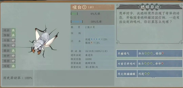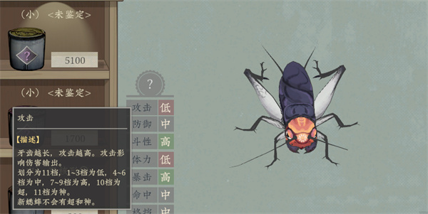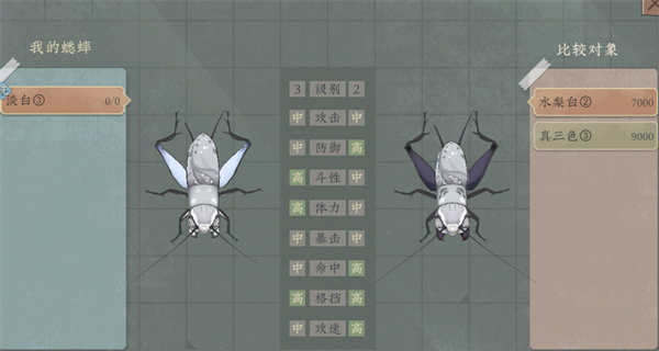 没有两只属性相同的蟋蟀,也没有两只长相一致的蟋蟀。有些蟋蟀触须断了一截,有些两条尾巴都秃了,有些甚至少了一条大腿……游戏不会直接告诉你蟋蟀属性的具体数值,但会指明大致的范围并提供对比。另外,你可以通过360度旋转来观察蟋蟀,根据其长相和数值面板来估算它的强弱,比如翅膀越长斗性越强......
