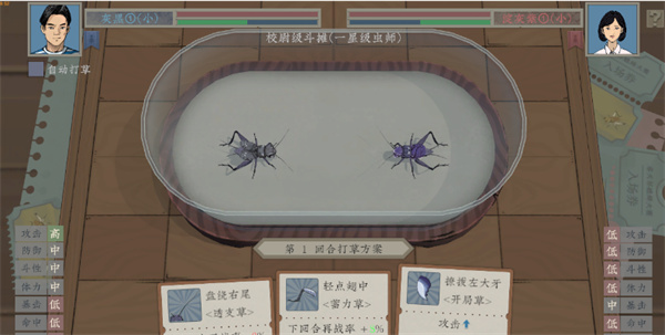 这下也就算进入正局了,在斗蛐蛐中同体质的蛐蛐只能和同体型的战斗,玩家给出决策,之后就要靠蛐蛐自己的能力和运气了。
