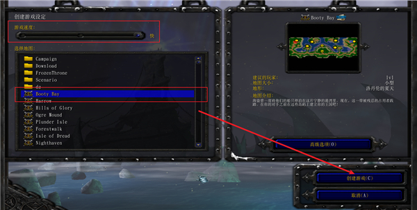 3、上面选择游戏的速度,然后选择想玩的地图,最后点击创建即可。
