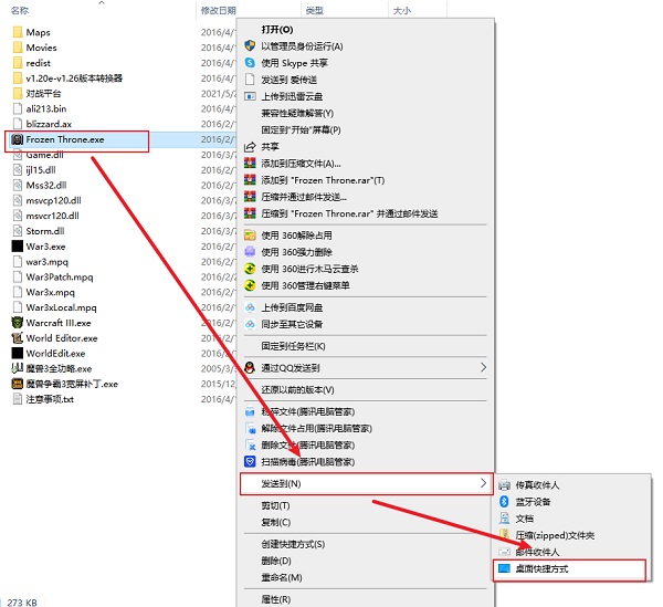 1、选择Frozen Throne.exe右键选择->发送到->创建桌面快捷方式。