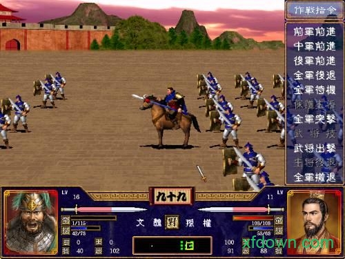 首先进入战前准备,交战双方的人马会同时出现在屏幕两边,交战规则采用淘汰制,每次各派一名将领出战。胜利的武将可再次出战,而败阵或平手的武将便无法再出阵。直到一方不能再派出武将为止。而在此可对武将的出战顺序、阵形的选择、武将在阵形中的位置以及军师指令进行调配。当然,如果看出大事不好,也可选择退兵——脚底抹油,开溜。但要记住:若连续退兵三次而未能进城休息,第四次退兵时将会全军被俘。