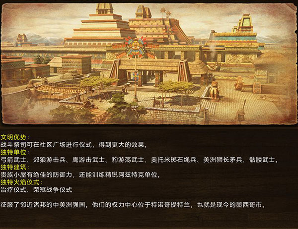 独特部队:土狼游击兵、投石兵、美洲狮长枪兵、战斗祭司、雄鹰游击武士、美洲虎徘徊武士、弓箭武士、骷髅武士、雨神独木舟
