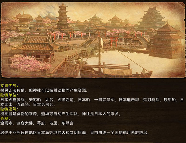 独特建筑:神社、东照宫、金阁寺、幕府、镰仓大佛、乌居奇观、樱桃园和道场(自动免费生产军事单位)