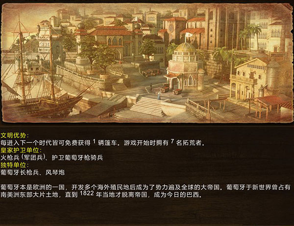 葡萄牙是历史上是世界上第一个寻找并且发现新世界航线的国家,但与历史不同、游戏中的葡萄牙却是典型的越后期越强的国家。前期没有农民支援发展略无力,但后期火药武器发达,火枪手、散兵、龙骑兵、炮兵都是同类兵种中的顶尖,大多数军事加强卡在工业时代才能拥有,而免费的城镇中心马车又使得快速发展很容易,故葡萄牙的主流打法是防守龟缩上工业,后期经济军事样样顶尖的葡萄牙很强的。葡萄牙拥有强大的火枪手,工业加成后堪比英国红衣火枪;而后期射程高达20的龙骑兵更是恐怖。葡萄牙的管炮类似于连发机枪,杀步兵效率很高,特别是密集的敌农民在管炮面前只有被杀。并且近卫级别管炮与格林除起手时间外没有任何差距。
