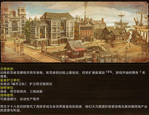 现实生活中的荷兰是一个极为看重商业的民族,而在游戏里金钱就是整个民族的核心和特色。荷兰独有制造钱币的银行(世界上第一个发明现代银行制度的就是荷兰这个国家)前中期约等于4农采金效率,4银行就相当于16个农民;在中期可以为荷兰带来极大的经济优势,殖民时代作战经济不差、可训练散兵使其在殖民时代作战中拥有操作性的明显优势,堡垒时代可生产1人口的手枪骑兵和拥有优势升级的长戟兵;后期在别国是很缺钱的时代而在荷兰却拥最多有10个银行(相当于40个农民)来支撑,不缺钱。但后期50农民的上限严重制约了经济平衡,好在可以通过渔船和贸易站加以补充。荷兰的步兵实力不强,长戟兵可以加速,但是加速后会对步兵战斗产生影响。
