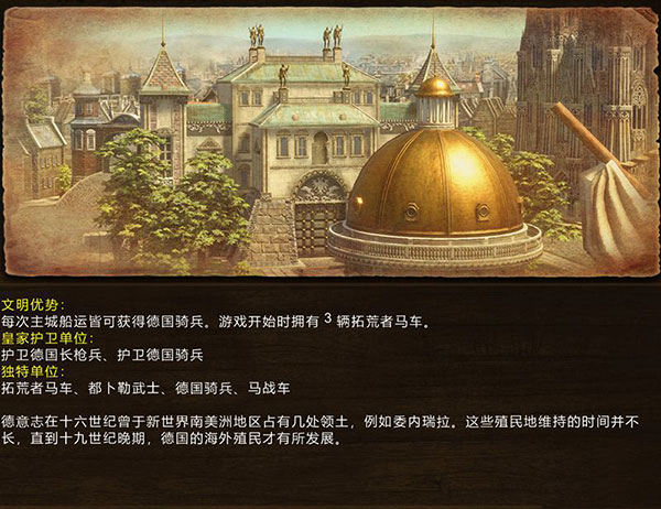 法国早在路易十四时代是欧洲各国的军事文化和高雅文化的典范,而拿破仑的出现更是用法国的强大撼动了欧洲。他们不仅拥有强大的骑兵、散兵炮兵,还有独有的强大范围杀伤的胸甲骑兵,在后期非常强大。历史上法国人很重视与土著人拉近亲密关系;游戏中同样保留了这一独特之处。法国拥有免费的土著侦察兵,并且还能在中心强化土著战士的战斗力。法国使用猎人进行资源采集,他们除了采集效率高于一般村民,攻击力和血量同样不俗;性比价甚至超过了德国的马车,前中期不仅生存能力极高、甚至可以作为直接的战斗部队给与敌人快速的打击,更快的骚扰经济实力强的国家。