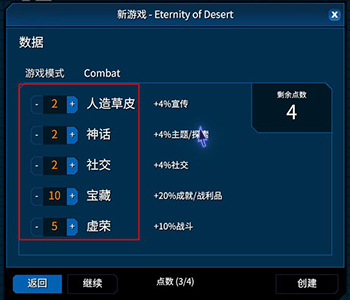 4、选择好你想要的游戏类型之后,进入下一步。这一步我们要对游戏进行加点,我们一开始是有4个点的。后面你的游戏版本升级是会给你新的点数,但初始加点很重要。