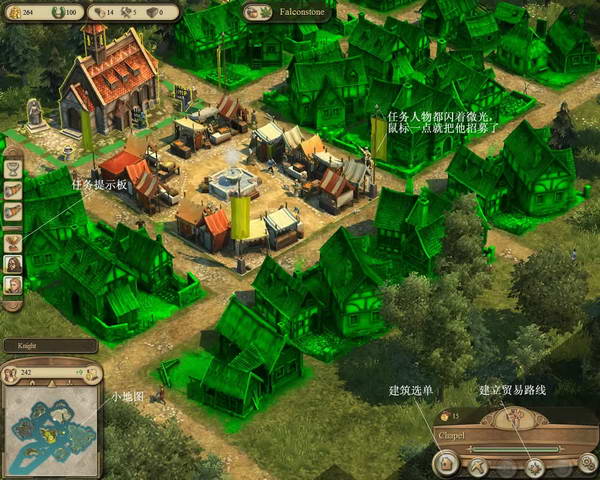 3、盖伊叫玩家在殖民地里招收10个骑士,放大自己的殖民地,看到那些扛着武器牛比烘烘的人,用鼠标点他一下,就招募了,招募10个后,用船运到盖伊的港口,完成。