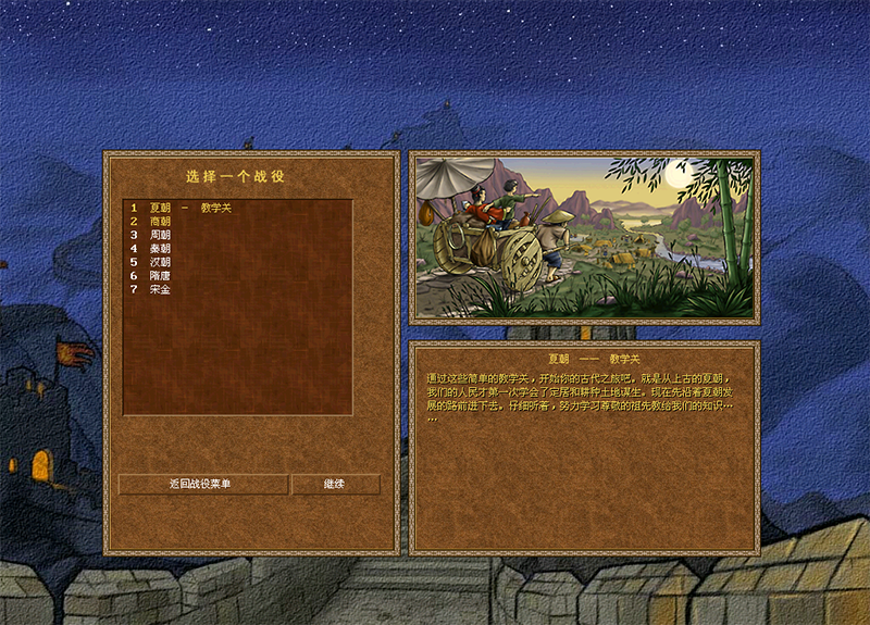 1、游戏共提供夏朝、商朝、周朝、汉朝、隋唐、宋金七个战役,让玩家了解中国古代历史。除了城市建设,玩家还可以体验一些大工程的修建,如长城、大运河、兵马俑等。第一个战役夏朝是一个教学性质的关卡,玩家领导一个半坡和二里头的部落在河边定居。最后一个战役,玩家扮演一个侯王,建设首都,抵挡蒙古人入侵。