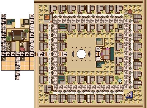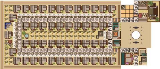 上述布局沿用了56格环形布局的基本思路,左右两个居民区各45住房,道路均为56步的环形,在房屋达到顶级的状态下,各可容纳74*45=3330居民,两边合计容纳6660居民。该布局最大的优点在于“在保证单个居民区居民数量最大化”的前提下,实现了“居民区面积的最小化”,在建造万人以上的大城时,将上述居民区两两组合、成对建造,则其“节省土地”的优势越发明显。