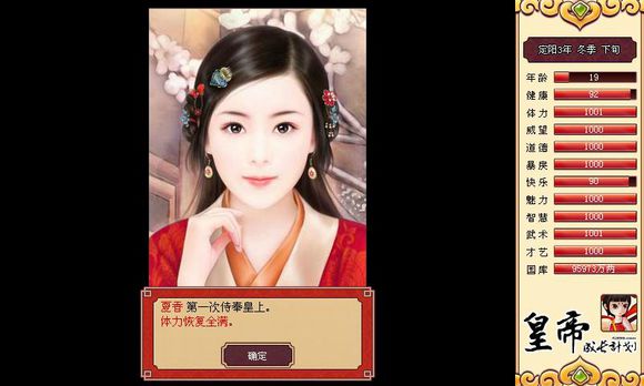 如果前期你注意到了这些,那么即位10年的时候你没有8000万两是不可能的(我按照这样的方法,最少的一次是9000万,多的一次是1亿5千万),而你的魅力值最少必须在250以上(魅力值不要超过250,多了也没用,我试过了。)后宫起码你都有3个左右的历史美女了。而你手上的武器储备估计也相当可观了。