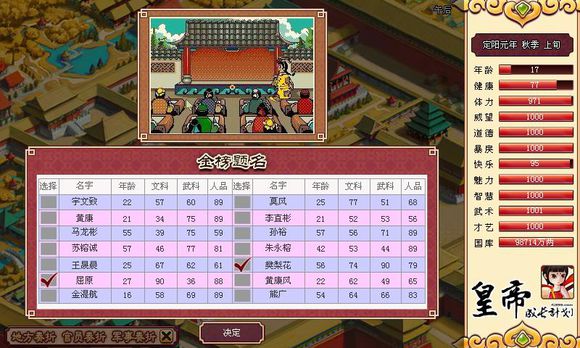 第二:开科考试:不要以为前期魅力值低开科考试就没有意义,恰恰相反,意义很大。当你有了足够的体力的时候,每次早朝就要开科考试,考试选***的人才不要看他的能力值,只看他的人品,人品跟清廉度是对等的,人品越高,清廉度越高,忠诚度越高。选择清廉度在80以上的官员将你的官员体系内全部清廉度低的给与代替。这样你的财政赤字在前期你没有开展建设和网罗到名臣的条件下依然会大大减少。