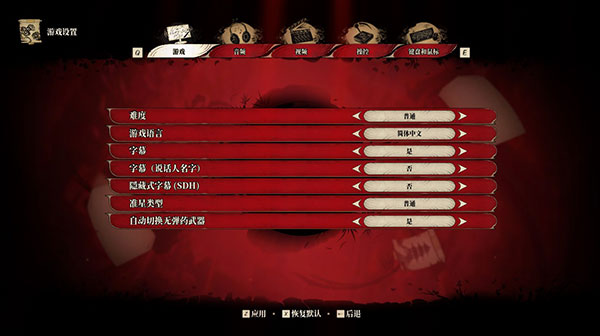 5、“游戏”设置界面,可设置难度、游戏语言、字幕、隐藏式字幕、准星类型等