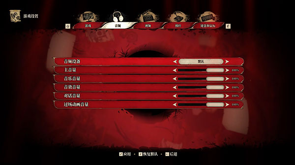 6、“音频”设置界面,可设置音频设备、主音量、音乐音量、音效音量、对话音量等