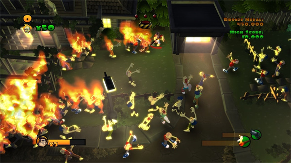 燃烧丧尸(Burn Zombie Burn)是由Doublesix进行制作的一款动作射击类游戏,它在2010年进行游戏的发售,本作采用了上帝视角进行游戏,你能够直观的看到从四面八方涌现出来的丧尸,比如爆破僵尸、传染僵尸以及“放屁都会冒火的超级僵尸,游戏以单人模式进行,没有多人模式。单人游戏分闯关模式,挑战模式和训练关卡。闯关模式有6个场景,4种模式:没有限制、丧尸逐渐增多的自由模式,有时间限制的时间模式,一开始就大量丧尸的计时的生存模式,保卫DAISY的防守模式。燃烧丧尸将带领玩家进入爽快的杀戮世界,让你能够在这里发泄出大量的压力,如果喜欢可以下载!!