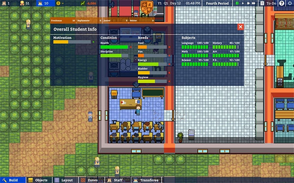 学术界:学校模拟器的配乐也是经过原创制作的,各种下课铃和鼠标点击的声音都能够给玩家带来轻快的感觉。游戏在创作玩法元素上非常的优秀,充学校的建造到学校学生的各种课程管理上都非常的丰富,你不但能够为学生打造体育课和游泳课等奇葩课程,更奇葩的是您的学生非常的有可能不来上课,或是在学习干一些奇怪的事情,这个时候就需要您创建保安、老师或是其他的管理层,还需要注意的是,你必须合理的经营才能够让您的学校创建下去,否则也只能够破产处理呀!