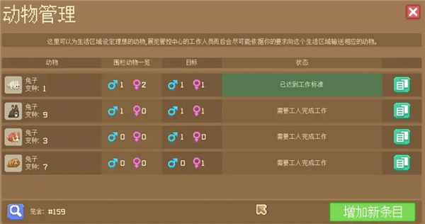 (注意:笼舍内动物数量超额时并不会自动放生,因此需要配合绝育来达到控制动物数量的目的。但这样一来每个笼舍的上限最终会被控死,想保持动物多样性还需要手动设置,有些繁杂。)