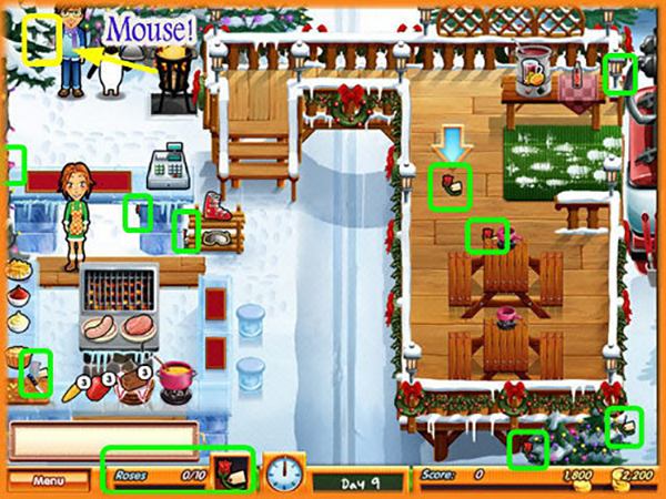 3、场景以圣诞节的雪天为主,贩卖食物让顾客感受到餐厅的温暖,新元素的不断增加也使内容更加充实。