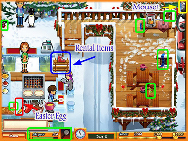 4-3找滑雪用具(有一处很难找在饮料桌子后面的围栏边靠着一根细细的滑雪杖)(此图上所指的复活蛋位置是错的,正确的在右上角老鼠的那个地方)