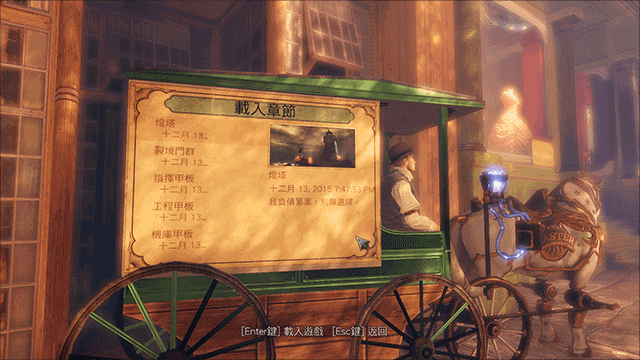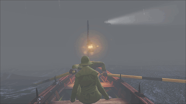 9、接下来,就是开始正式冒险了,玩家首先乘坐小船前往一座灯塔,前面2位划船的人是带着特殊使命护送侦探布克(玩家)来到灯塔的线索人物,玩家可以好好听听他们的对话,借此对游戏世界观进行补充。