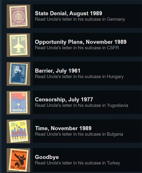 在一周目抵达土耳其之后,我们的叔叔会独自离去,而他的手提箱会留在副驾驶座位上,而他的告别信上的邮票仍然会根据所在城市的不同而变化。因此我们在一周目没有收集到的邮票可以回到该城市收集