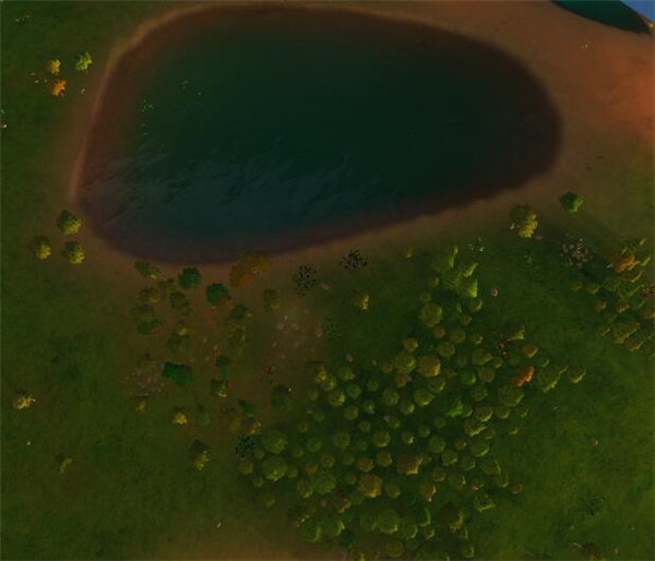 首先,游戏开始,在旁白讲述完开场对白(无法跳过)之后,选择一块地方安放你的殖民地中心石碑。这里建议选择在有宽度适合的水域,且周围拥有一定数量的树木和小块石头的区域。如下图: