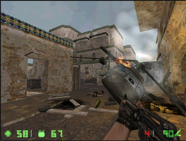 黑鹰已经坠落,伤亡是肯定有的,但仍然有几个三角洲队员深陷重围,“绝对不能让一个弟兄留下“!于是我开始拯救行动。。我呆在燃烧着的黑鹰旁边,这时候敌人已经蜂拥着冲了过来,我端起了手中枪,嗒嗒几个点射。继续往敌人腹地挺进,来到一个房间,解决掉冲出来的两个敌兵,四周一看已经没有路了,我大骂一声一梭子子弹打在了墙边的几个木箱上,墙上一个破洞显了出来,就从这里过去,在铁架上得到炸弹,沿木板上到二楼,只见墙面上红光一闪一闪的,按动5号键可以设置炸弹,然后闪到一边把头一埋按动了手中的引爆器,轰隆一声,墙被炸出一个大洞,我刚刚探出头去观察,就见一束红光扫了过来,我连忙退了进来:狙击手!我装好弹作了一个深呼吸,闪电般冲了出去,子弹不停的呼啸射出,对面楼上发出一声惨叫,敌狙击手栽了下来!上到房顶,进入房间便找到一名三角洲队员,了解了附近的敌情和失散的战友,我们便冲了出去,不能让他牺牲掉,所以我冲在了前面。掩护他进了一个水塔,安全后我便继续搜寻其他失散的战友,旁边两扇木门不能打开,用枪将门后挡住的木箱打烂就可以通过了,来到大院,我军的直升机正要降落,但地面和高墙上全是敌兵,我换成了机枪愤怒的杀了过去,地面全部清除完毕,我在返身寻找队友,一辆吉普车冲了过来,车上跳下几个敌兵,好在我早有准备,枪枪爆头!在旁边的房间找到已经被俘的战友,这家伙看来是吓傻了,呆在原地不肯前行,我告诉他:有我在,一切OK!终于我们安全来到大院,黑鹰已经等候多时了...难点提示:打烂身边任何木箱!