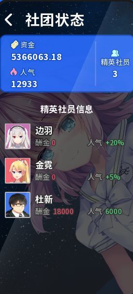 王牌社团(Ace Campus Club)是一款大学题材的社团模拟经营游戏,玩家将化身社长,从零开始带领社团走向“百佳社团”的目标。你只有50次行动机会,需要快速筹集资金、合理规划支出,并通过举办活动、收集情报、倒卖货物等方式提升社团人气。王牌社团游戏中共有五个社团与五位女主角,她们对不同社团的态度会直接影响人气加成,因此招募与运营策略十分关键。