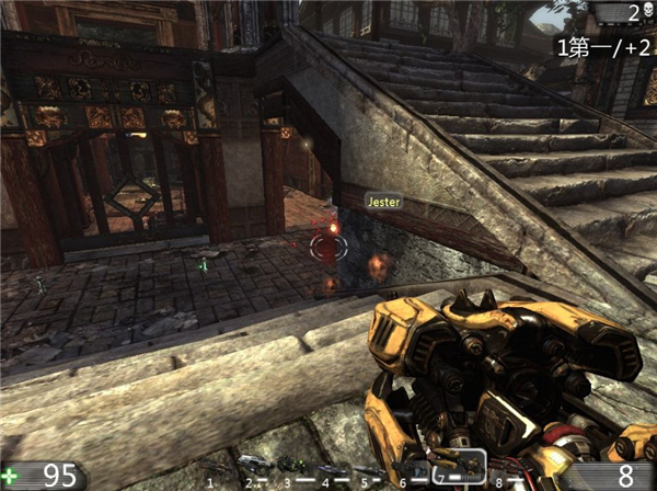 我们进入门以后会看到一个机器人,我们需要按1键切换成冲击锤,靠近哪个机器人机开枪,把机器人弹开。