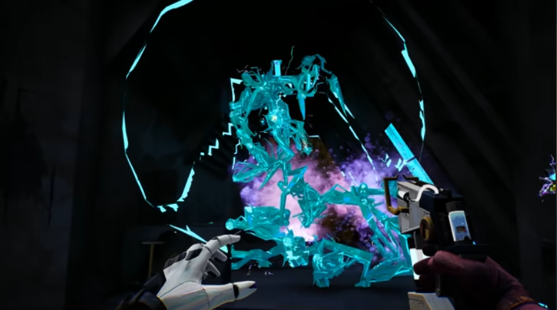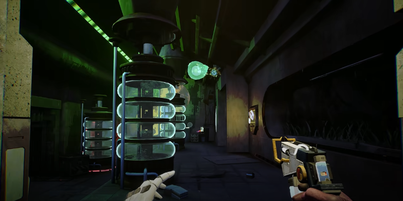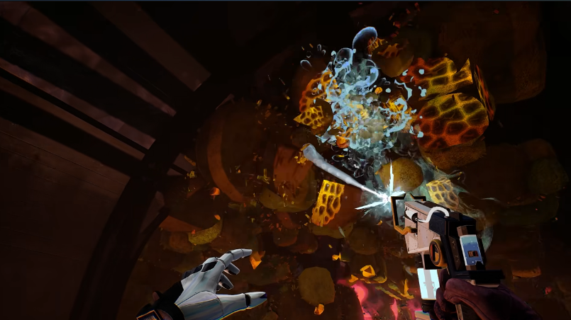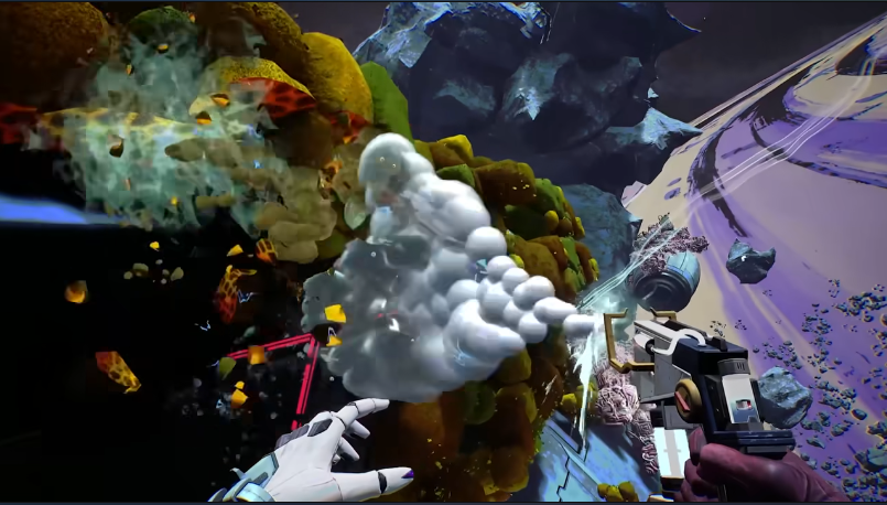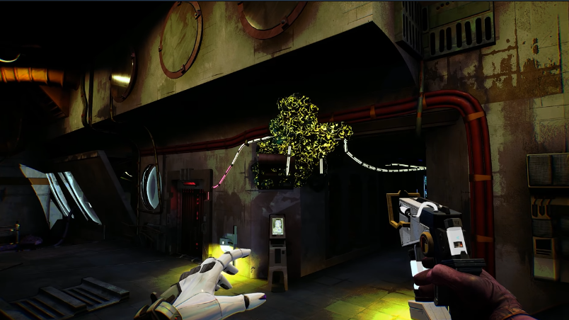 3、玩家需要利用手中的喷雾枪来消灭这些肆意生长的真菌,面对高处的真菌,利用激射可以处理更高更远的真菌。