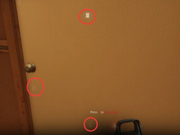 6、门有最基本的3种开门方式,靠近门把手是peek door,你会经常用到它,可以使用战术投掷物,检查陷阱等,视角往中间一点是open door,视角在门的下半部分是踹门(你们的最爱),注意,上锁的门一下踹不开,但是可以把门踹解锁,后续可以继续踹开门或者正常开门。当门后有歹徒且门是锁上的情况下踹门,这种举动和自杀没区别。