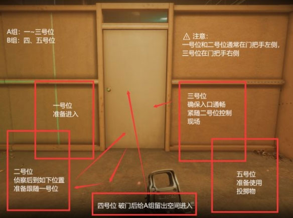 你的职责如下:破门前的倒数以及破门皆由你负责,在破门后,后退出空间确保A组(1~3号位)进入区域,视情况选择跟进或保证队伍后方安全。