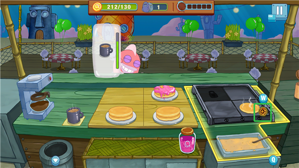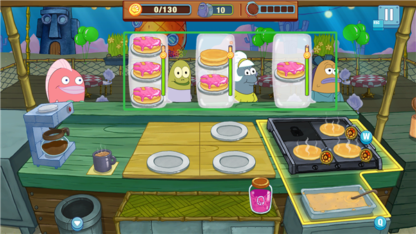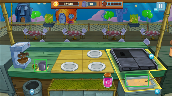 1、玩家扮演海绵宝宝,在比基尼海滩的多个餐厅中制作美食,服务派大星、珊迪、章鱼哥等角色。