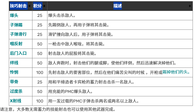 以下是和平使者卡宾枪特有的已知技能射击