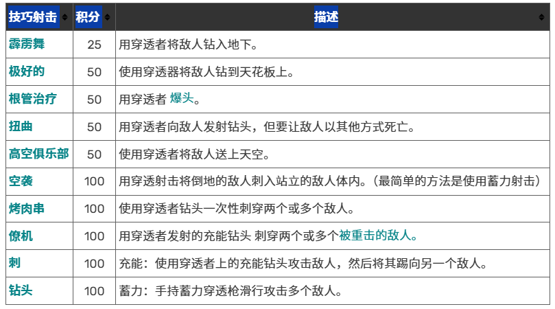 以下是穿透者特有的已知技能射击