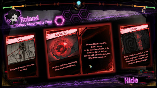 每个回合(幕)开始时,为每个人确定速度值-选择使用的卡片-使用对应的卡片进行战斗。此时战斗随着结果不同会为每个人积累一个“情感值”。情感值累计满时,在下一幕开始之前需要为其选择一个异想体卡片作为加成。