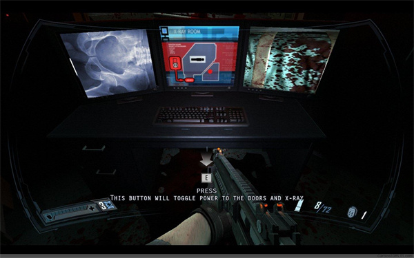 之后后碰到惨死的队友。没有时间悲伤,进入旁边的通风管道继续前进,之后左转来到手术控制室,关闭X光机以启动门