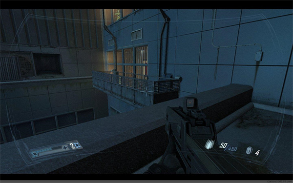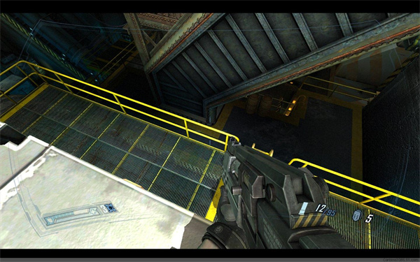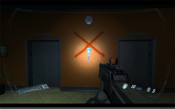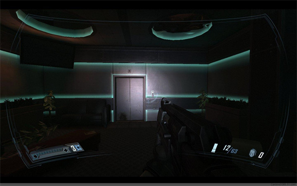 继续前进到一环形走廊处,跳下去一路前行,与敌人交战后来到一玻璃大厅,不要贸然出去,外面有5~6个隐形兵,堵在门口等他们送上门,用霰弹枪近距离轰杀。消灭敌人后下楼,启动电梯,注意电梯内也有一个隐形兵
