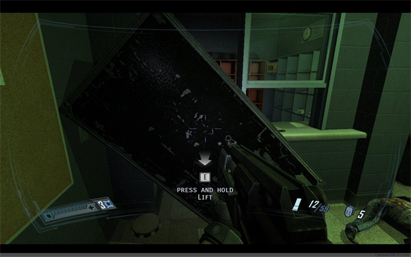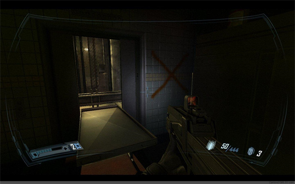 并用钥匙卡开病房旁边的门。一路前行战斗,最后来到太平间,跳入电梯,然后推开卡住电梯的手术台(图)后电梯上行到上层,