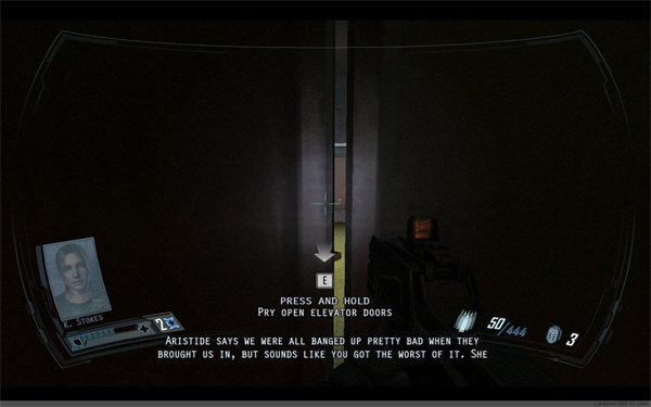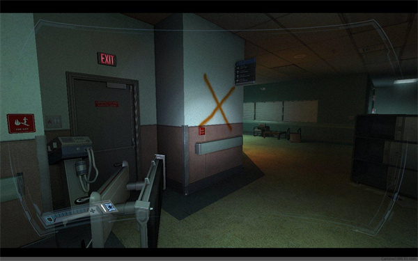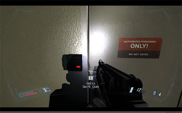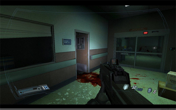 在等待电梯的时候别忘了消灭身后从二楼跳下的敌人。电梯启动后,因敌人破坏,只得继续徒步前进。在一间病房的尸体旁拿到钥匙卡